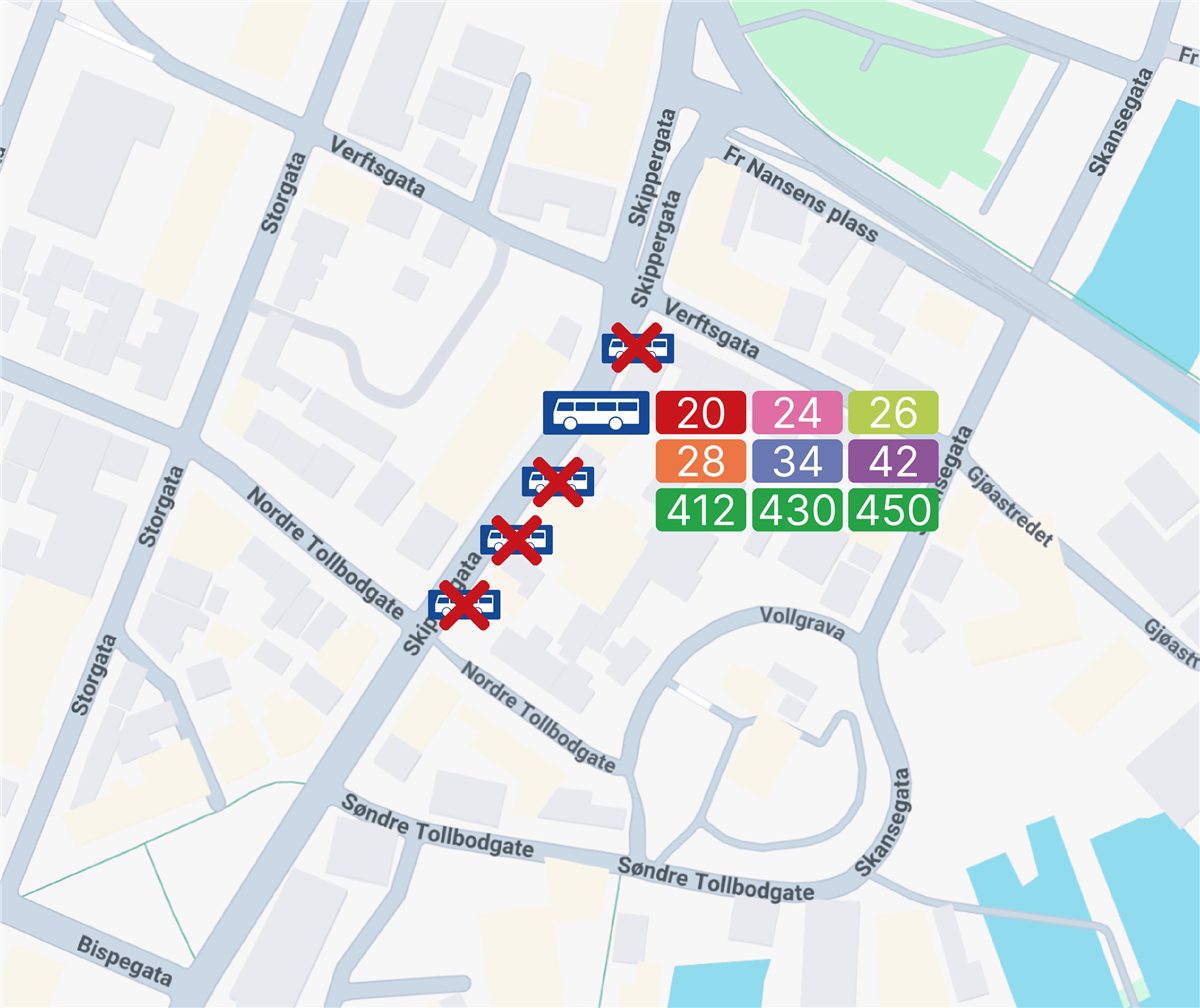 Fra mandag 10. november vil de fem plattformene som lenge har utgjort Skippergata holdeplass retning nord, slås sammen til én felles plattform. Den nye holdeplassen vil bli plassert utenfor Skippergata 19, se kartet nederst i artikkelen for nøyaktig plassering.